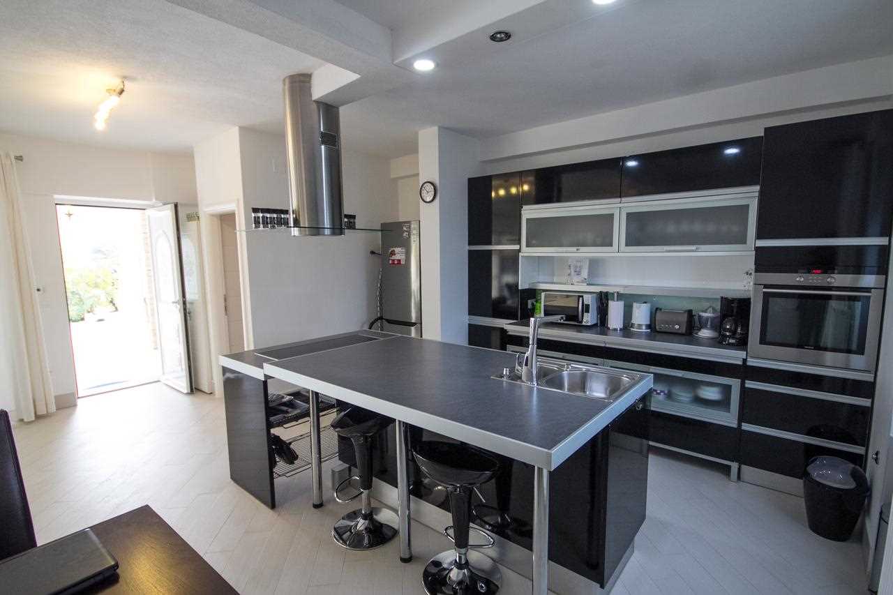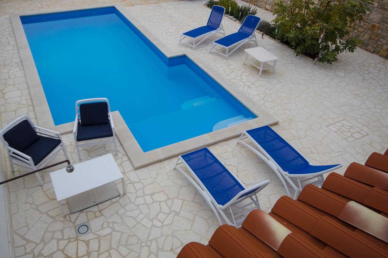 Eines der Apartments befindet sich im Erdgeschoss und bietet direkten Zugang zum erfrischenden Pool. Dieses Apartment verfügt über ein gemütliches Wohnzimmer, eine voll ausgestattete Küche, ein komfortables Schlafzimmer mit eigenem Bad und ein zusätzliches Badezimmer, sodass für alle Gäste Komfort gewährleistet ist.