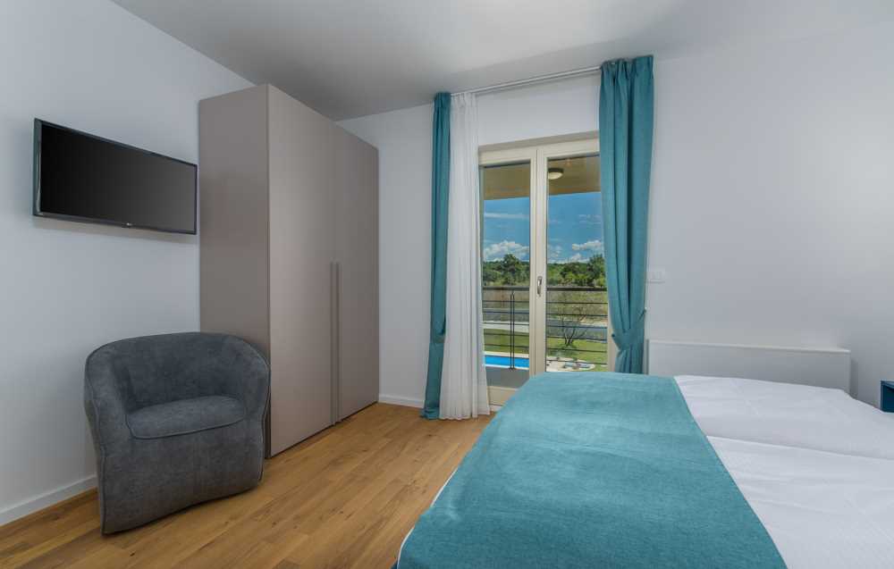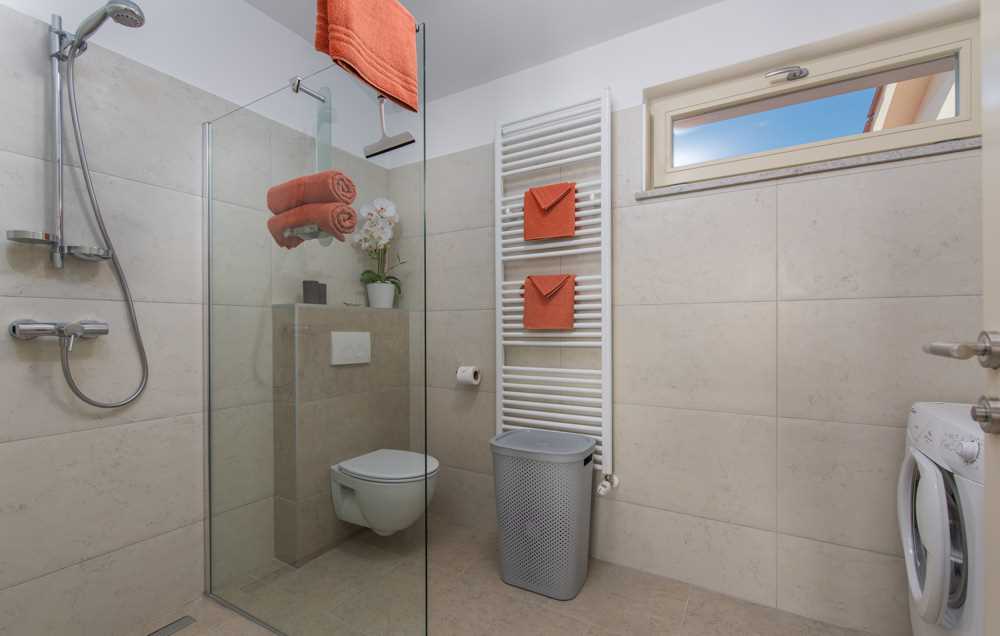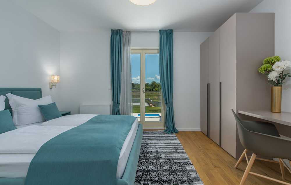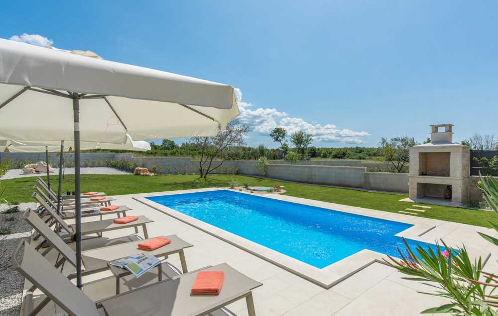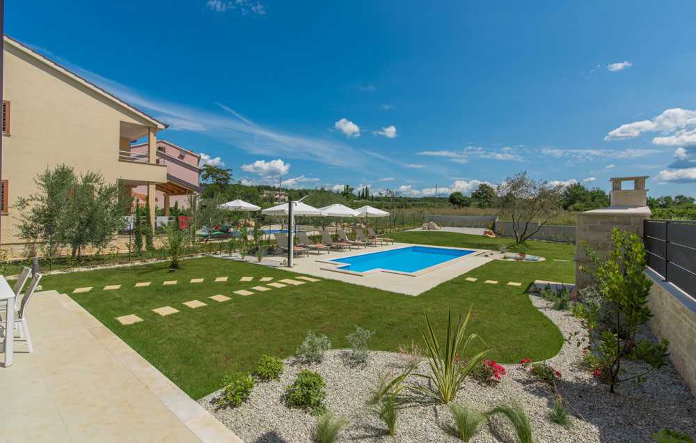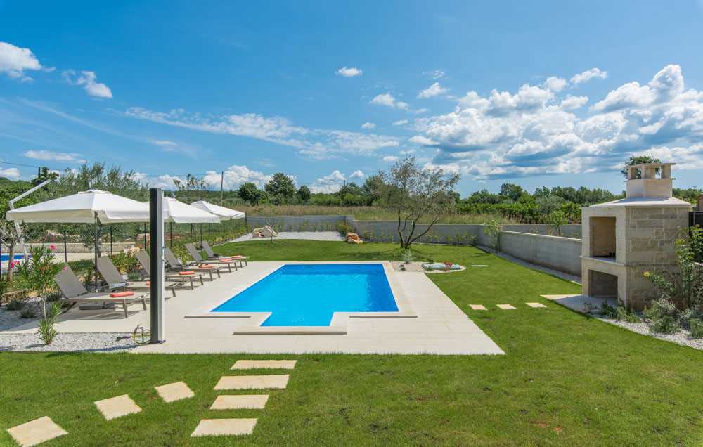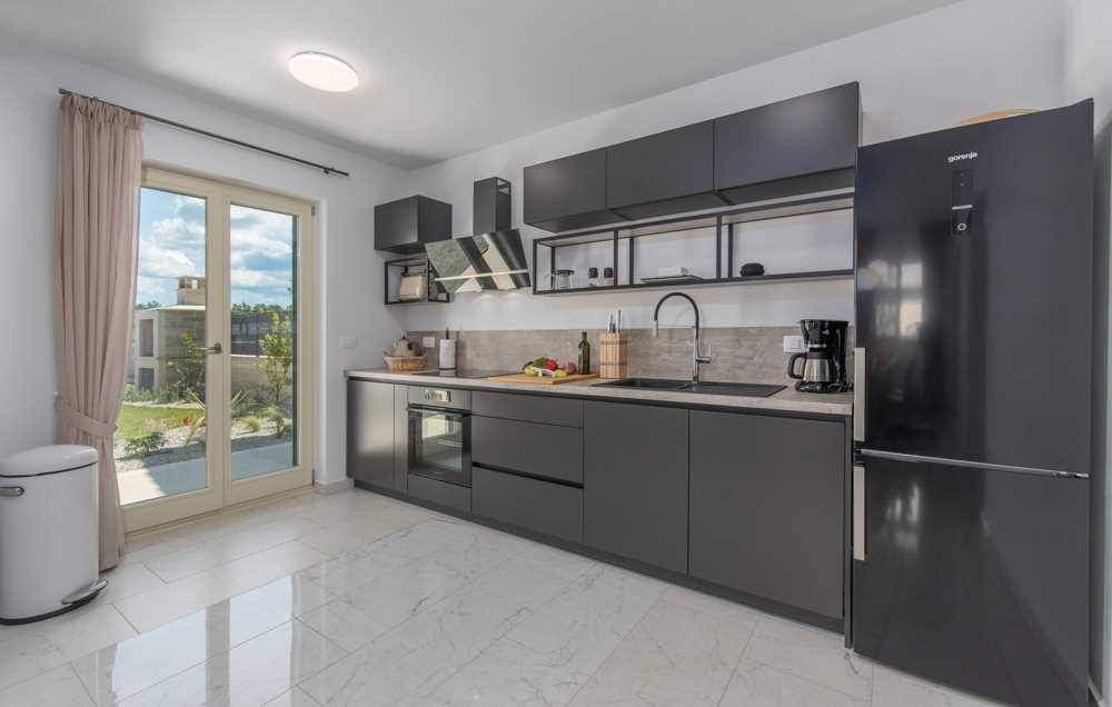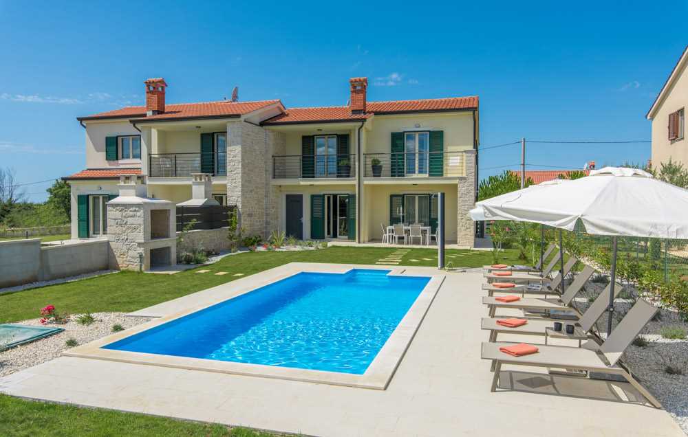 The villa was completed in 2019 and has since been available to holiday guests from near and far to relax from everyday life. The villa was furnished to a high standard in collaboration with an Italian designer. Most of the furniture was specially made for these villas. The house is furnished for 6+2 people. The combination of the houses with plaster and natural stone facades and many balconies reflect the Istrian architecture. The villa has a living space of 144m², which is spread over 2 floors. On the ground floor there is the kitchen, the dining area, the living room, a guest toilet and a bedroom with its own bathroom. On the upper floor there are two further bedrooms, each with its own bathroom. All rooms have a TV and are fully air-conditioned. The villa has its own pool and a large play and sunbathing area with a large BBQ grill. If you don't want to cook yourself, there are several good restaurants serving typical Istrian cuisine in the town and in the surrounding area. Pets are not allowed here.