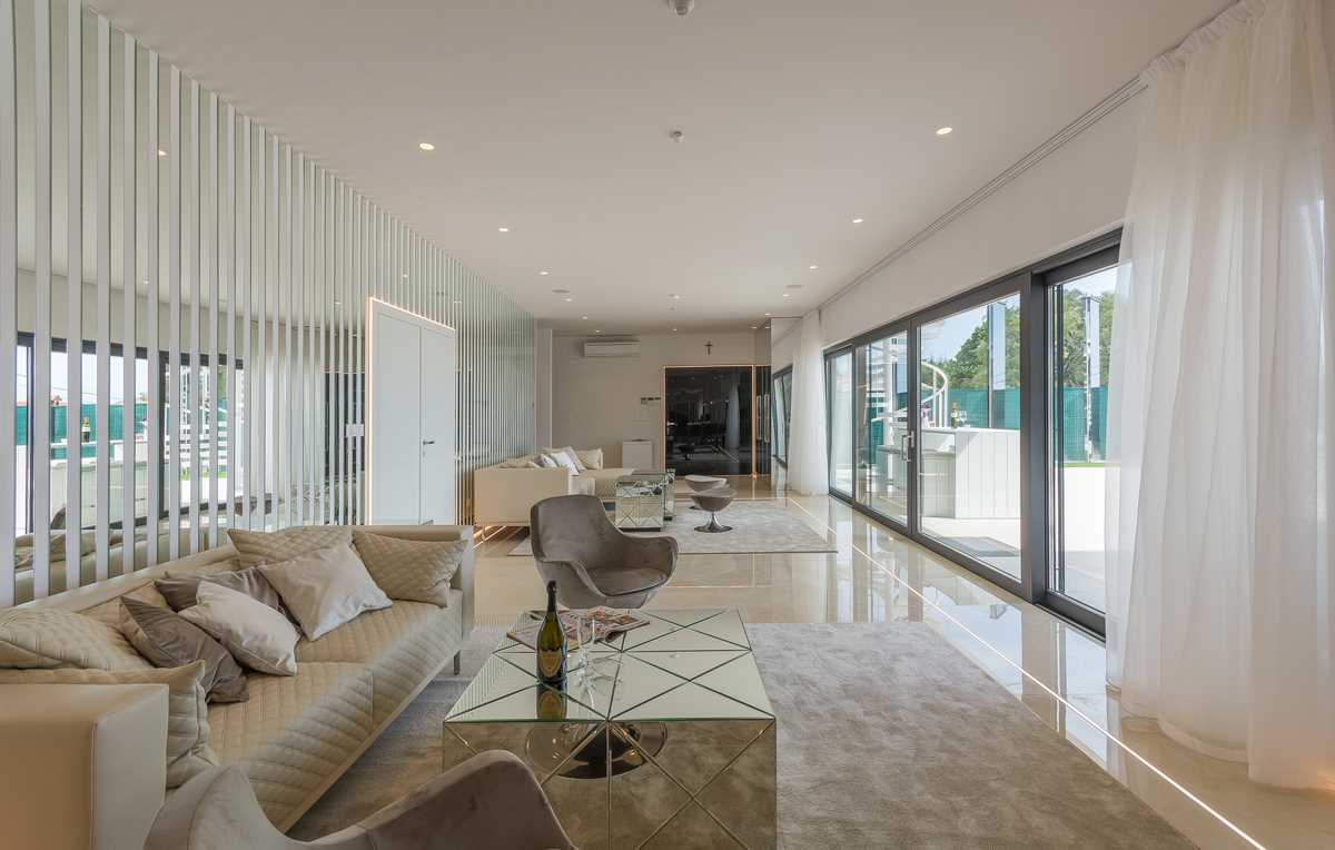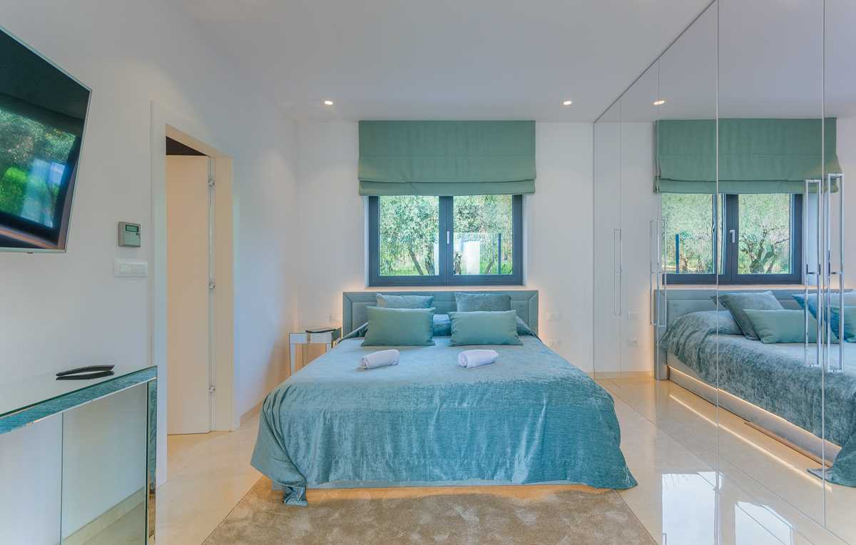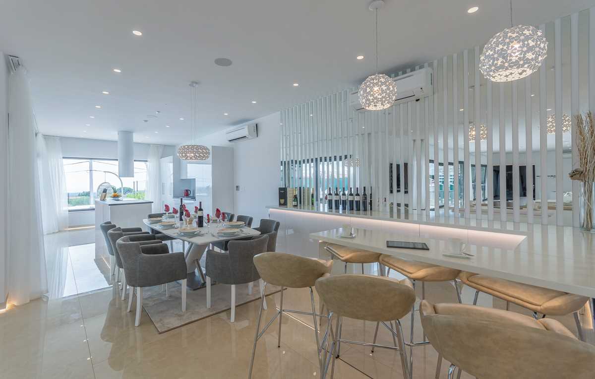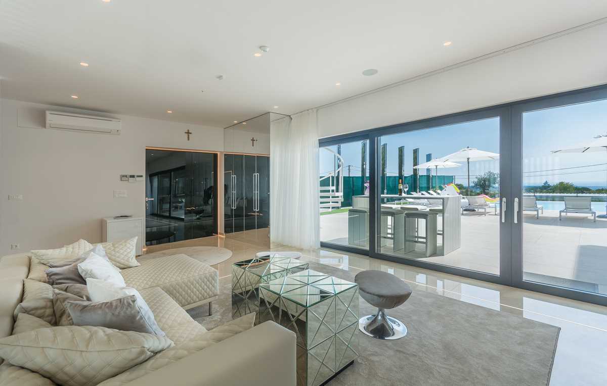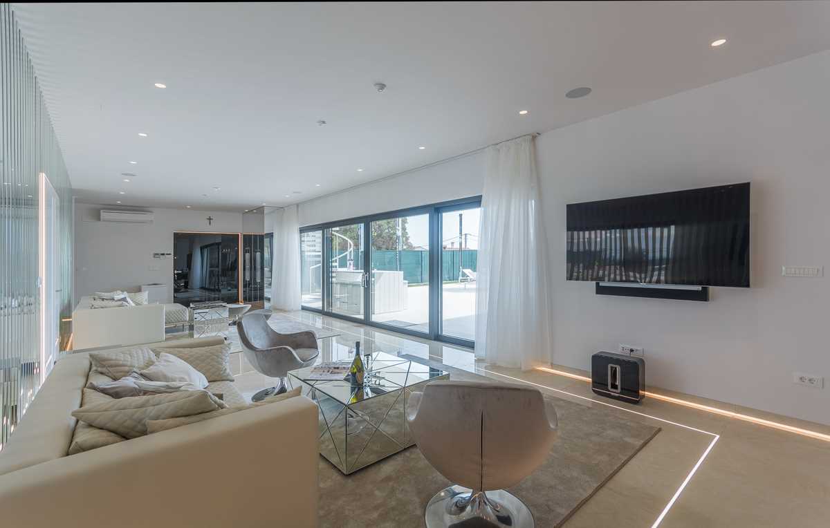 Indoors, the elegance of the villa is matched by modern style and sophistication. The spacious living room is thoughtfully divided into a cozy lounge area, complete with comfortable seating and armchairs, and a specially designed bar featuring a selection of fine wines, perfect for enjoying during pleasant evening gatherings with family and friends.