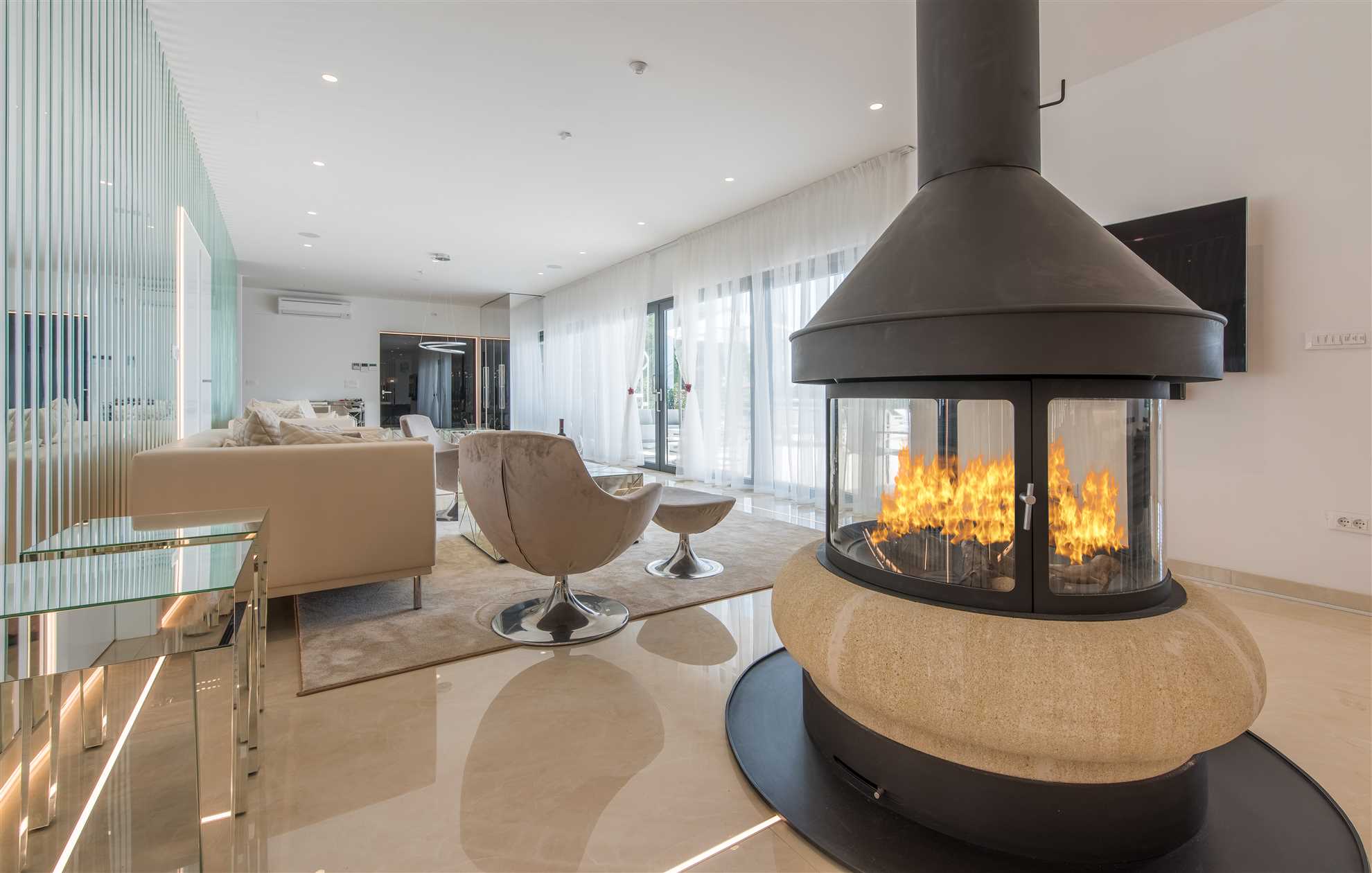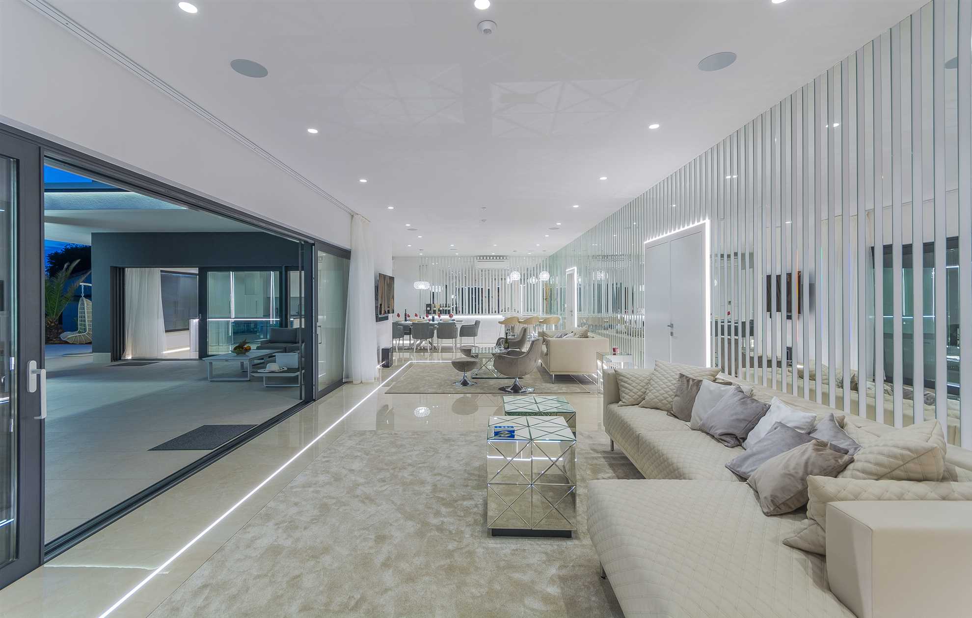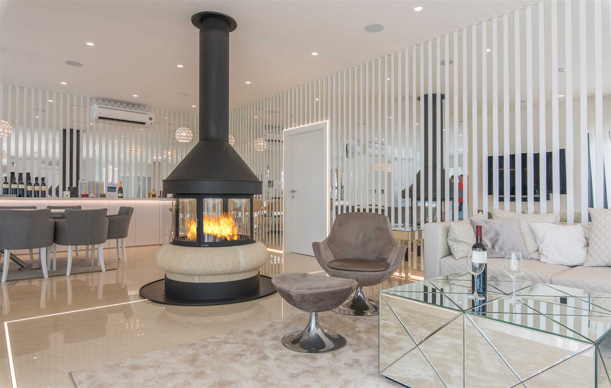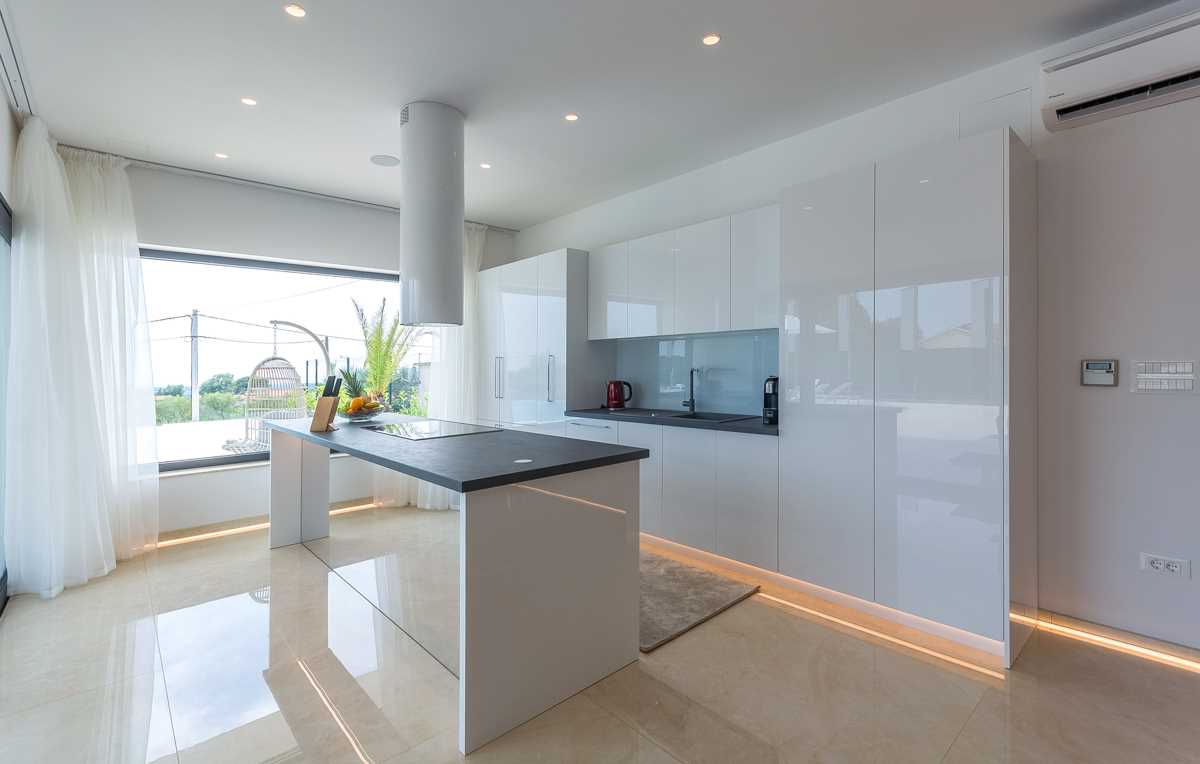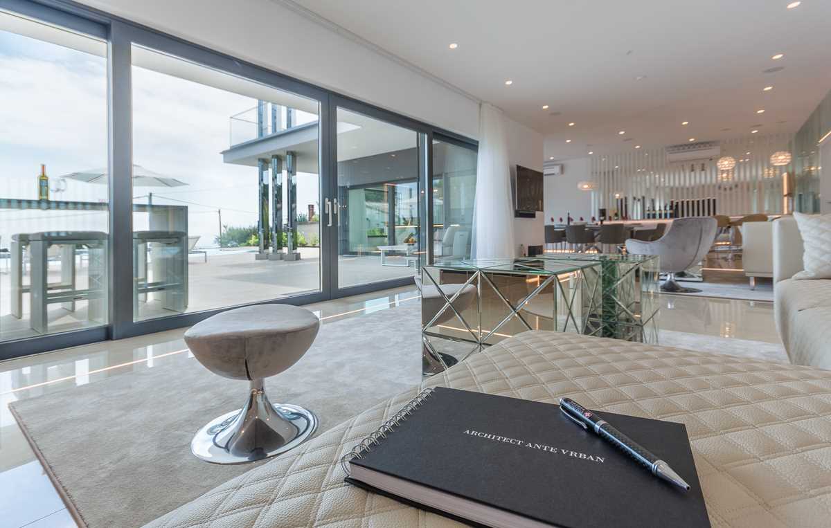 Indoors, the elegance of the villa is matched by modern style and sophistication. The spacious living room is thoughtfully divided into a cozy lounge area, complete with comfortable seating and armchairs, and a specially designed bar featuring a selection of fine wines, perfect for enjoying during pleasant evening gatherings with family and friends.